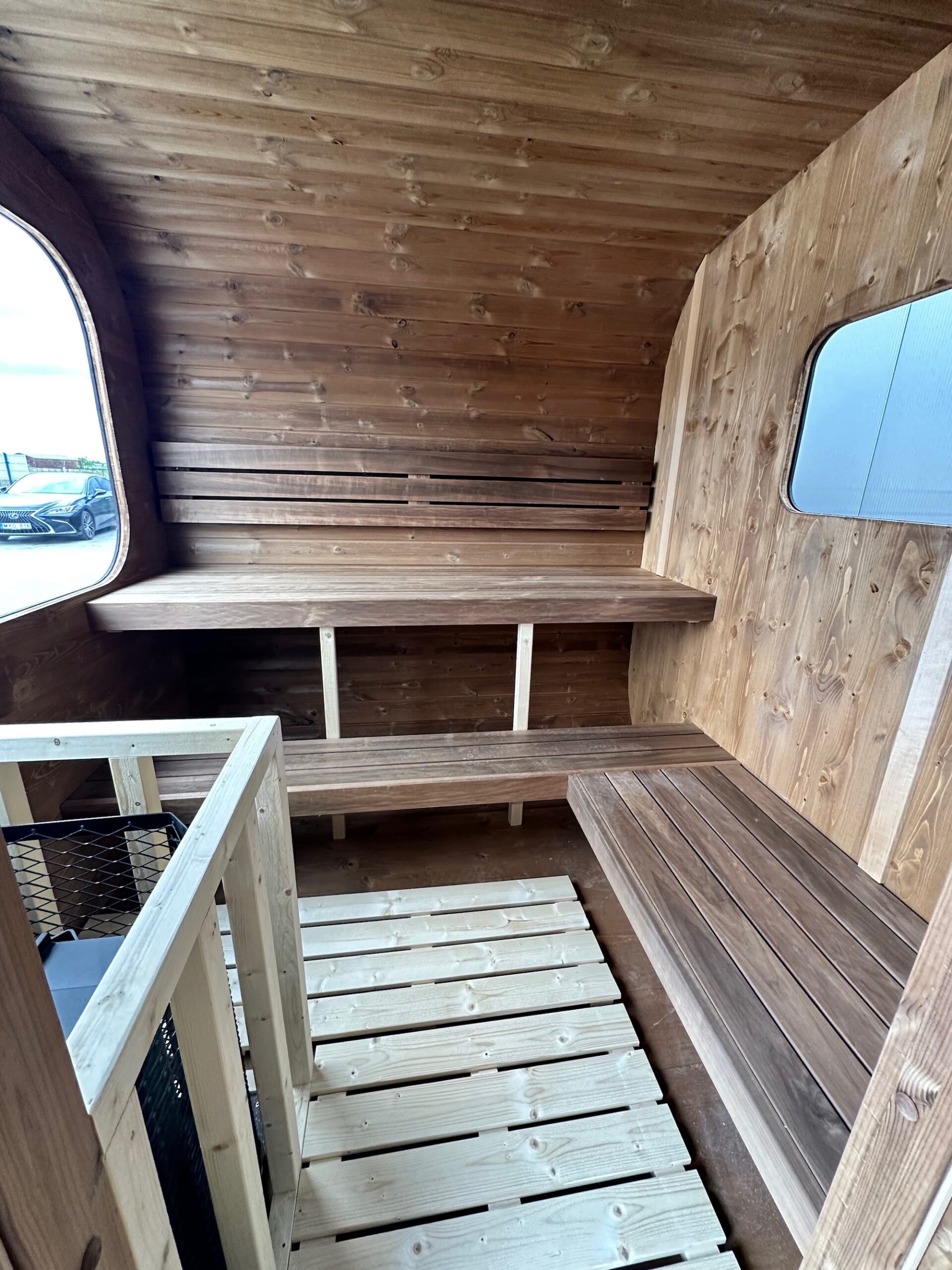 - Sfera sauna- piec Harvia M3 SL z kominem i kamieniami, LED oświetlenie, ławki z drewna termicznego w formie L
