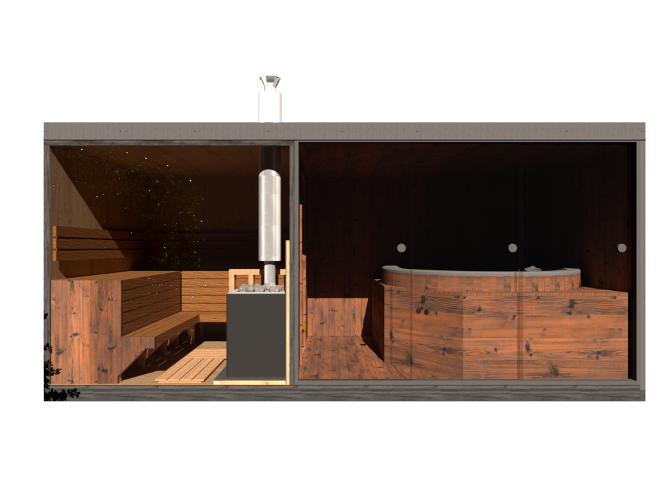 - Moduł A – sauna z piecem na drewno, lub piecem elektrycznym, ławki w formie L, hartowane szło, LED oświetlenie.